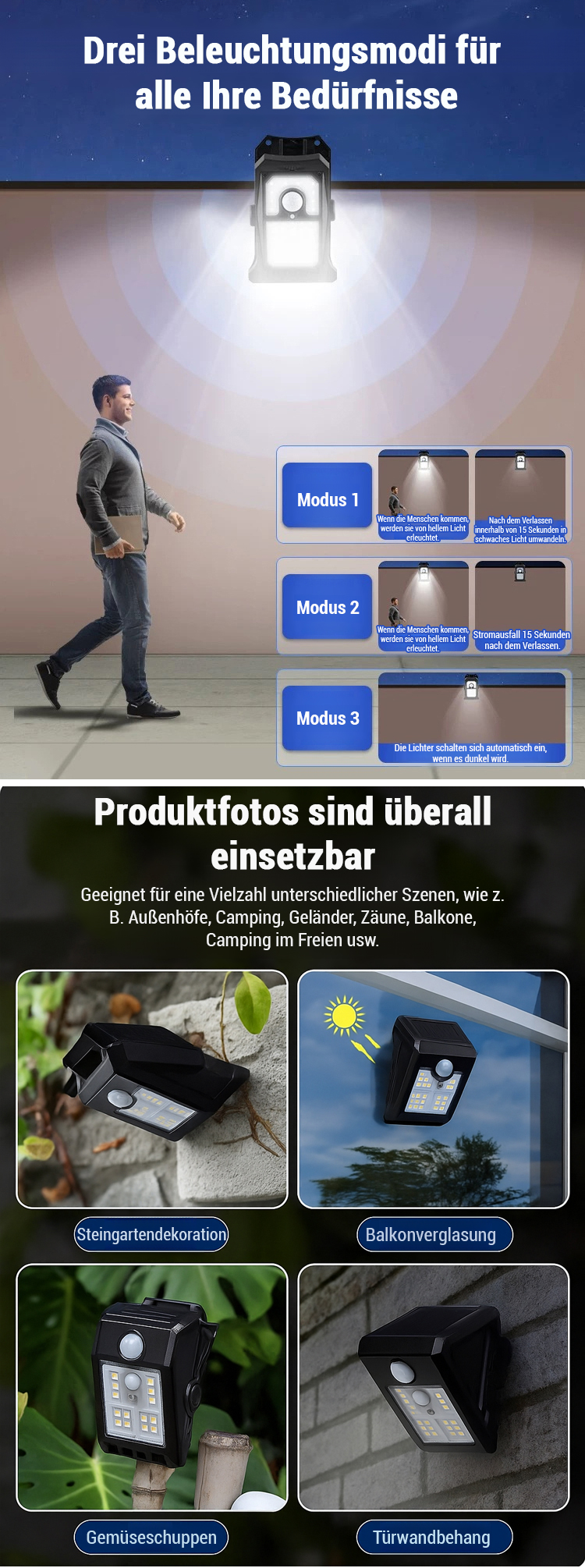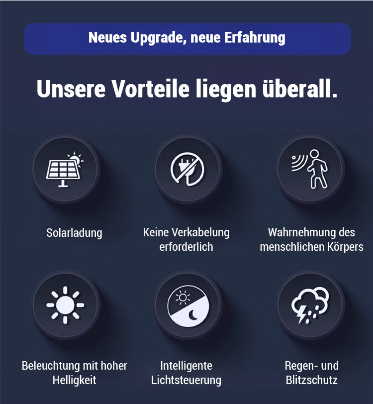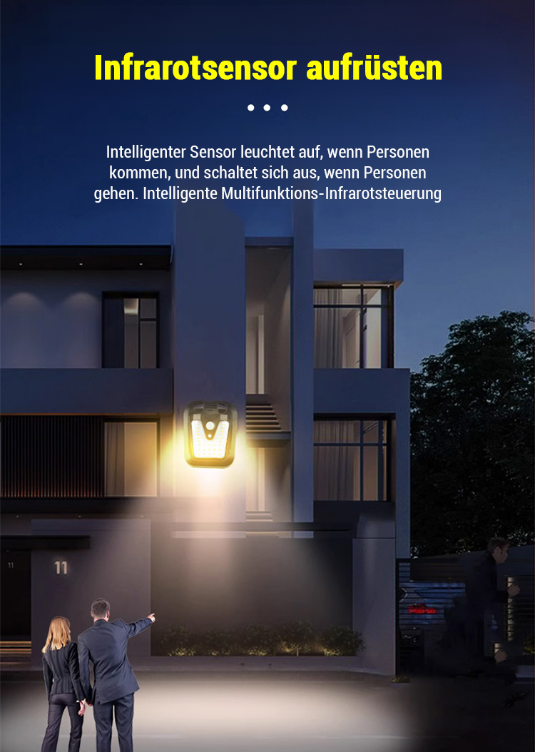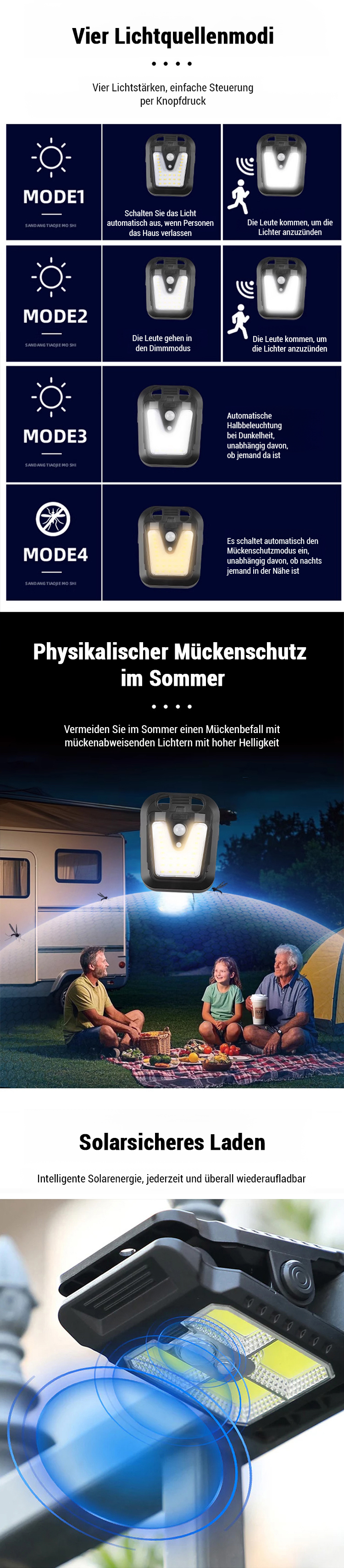 ⚡Regen- und blitzsicher, 💡beleuchtet eine Fläche von bis zu 50 Quadratmetern, 💫hält Mücken fern,🔆verfügt über vier intelligente Lichtmodi,🔴einen empfindlichen Infrarot-Bewegungsmelder und kombiniert Energiesparen mit Diebstahlschutz.